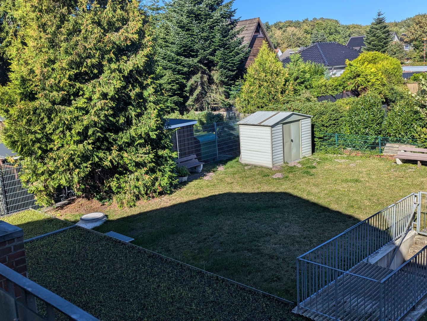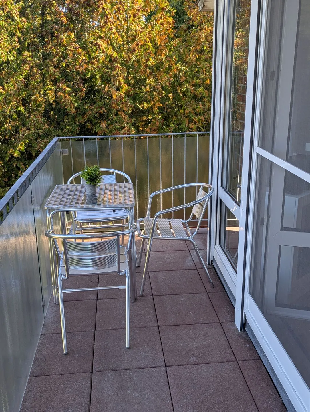 Das helle Wohnzimmer ist mit einem gemütlichen Sofa und einem Sessel ausgestattet. Für Unterhaltung sorgen ein TV und ein Radio. Über den Wohnbereich gelangen Sie direkt auf den überdachten Balkon, von dem aus Sie den Gartenblick genießen können – hier lässt es sich zu jeder Tageszeit entspannen, unabhängig vom Wetter.