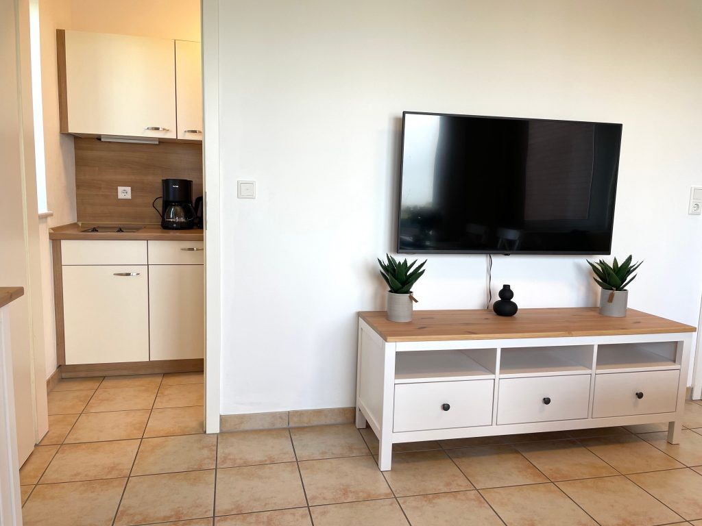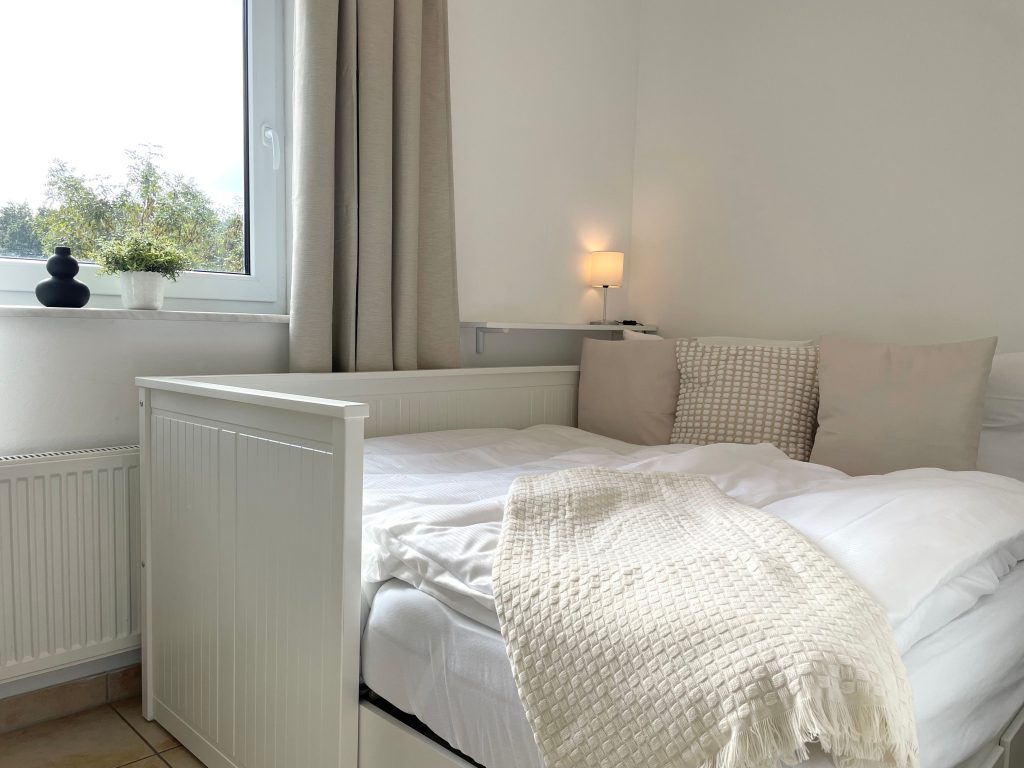 Diese Wohnung im 2.OG mit Aufzug bietet auf 51 qm Platz für bis zu 6 Personen und verfügt über ein Schlafzimmer mit Doppelbett, ein kleineres Schlafzimmer mit ausziehbarem Tagesbett, sowie ein Schlafsofa im Wohnraum.