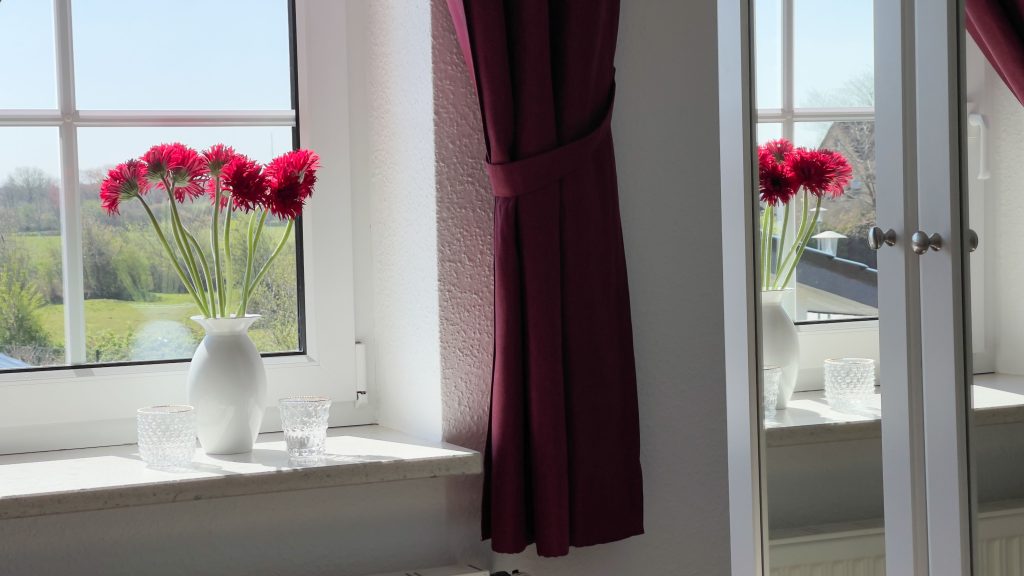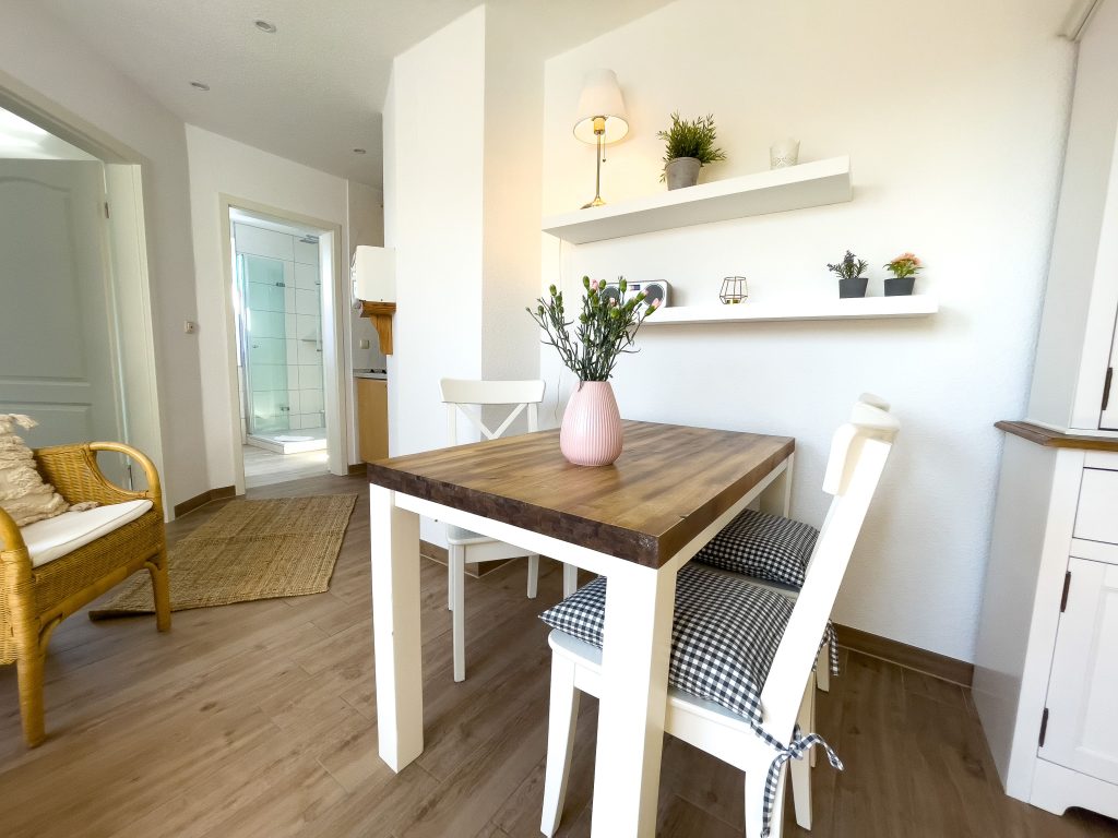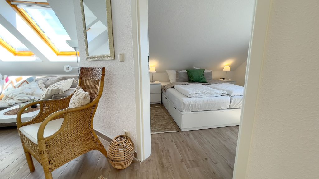 Die Ferienwohnung hat eine Fläche von 40 m² und ist ausgestattet für bis zu vier Personen. Sie liegt im ersten Stock eines freistehenden Hauses und ist hell und freundlich gestaltet. Im gemütlichen Schlafzimmer mit einem komfortablen Doppelbett und auf dem ausziehbaren Sofa im Wohnbereich finden Sie Ruhe für Ihren erholsamen Schlaf. Zu Ihrem Wohlbefinden trägt auch das moderne Tageslichtbadezimmer mit einer bodengleichen Dusche bei.