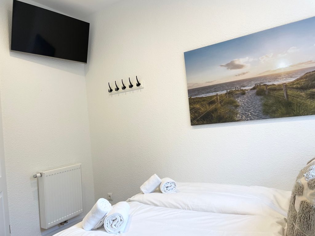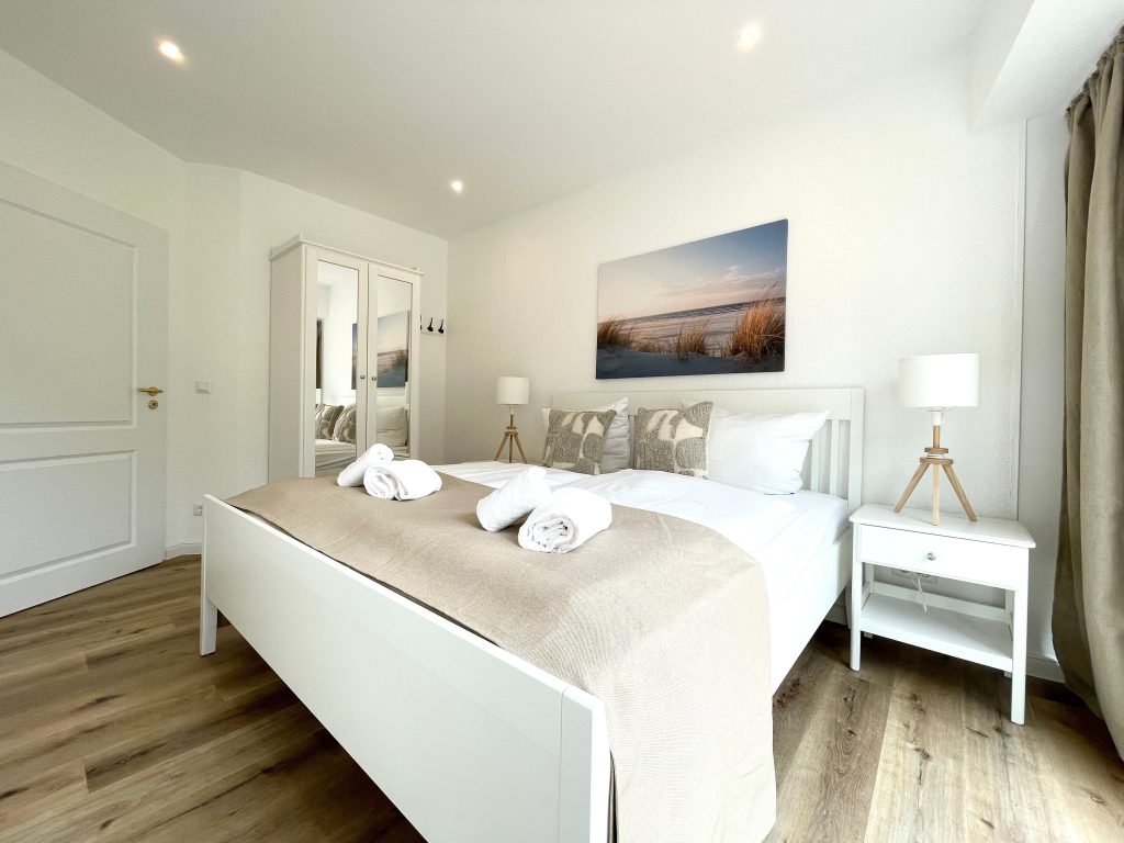Mit 3 Schlafzimmern, einem komfortablen Schlafsofa im Wohnzimmer und luxuriöser Ausstattung bietet sie genügend Platz für die ganze Familie oder eine Gruppe von Freunden. Zwei der Schlafzimmer sind mit großzügigen Doppelbetten ausgestattet, die jeweils 180 cm breit sind – perfekt für eine erholsame Nachtruhe. Das dritte Schlafzimmer verfügt über ein komfortables Bett mit einer Breite von 140 cm, ideal für eine Einzelperson oder Kinder.