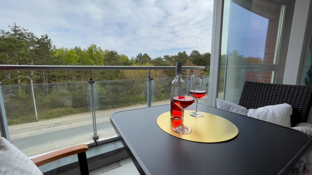 Der Balkon bietet ausreichend Platz, um dort Zeit zu verbringen und in den Abendstunden ein Glas Wein zu trinken.