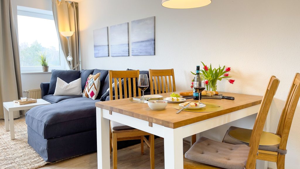 Die Wohnung ist im hellen nordischen Stil eingerichtet und verfügt über einen großen Wohnraum mit offener, vollausgestatteter Küche, Essbereich und gemütlichem Schlafsofa.