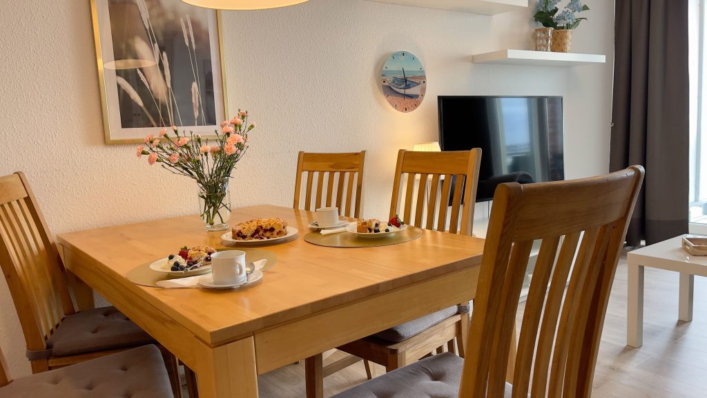 Die voll ausgestattete Küchenzeile mit Geschirrspüler lässt keine Wünsche offen. Ihre Mahlzeiten können Sie entweder am Esstisch oder auf dem Balkon mit toller Aussicht auf Wald, Watt und Wasser genießen.