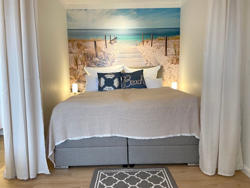 Das komfortable Boxspringbett, geschickt durch Vorhänge abgeteilt, lädt zu erholsamen Nächten ein.